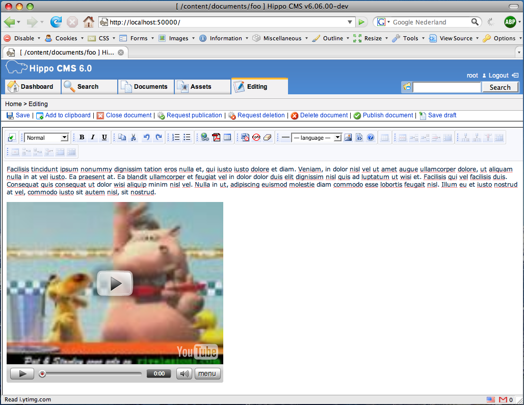 For anyone who has tried to add YouTube’s embed code into the Xinha What You See Is What You Get (WYSIWYG) editor of Hippo CMS: Yes it’s possible to add references to YouTube, Google video or any other Flash animation. No, just copy-pasting the HTML snippet from YouTube or Google video will not work, because it is not valid XHTML. I will explain how to enable YouTube support in Hippo CMS.