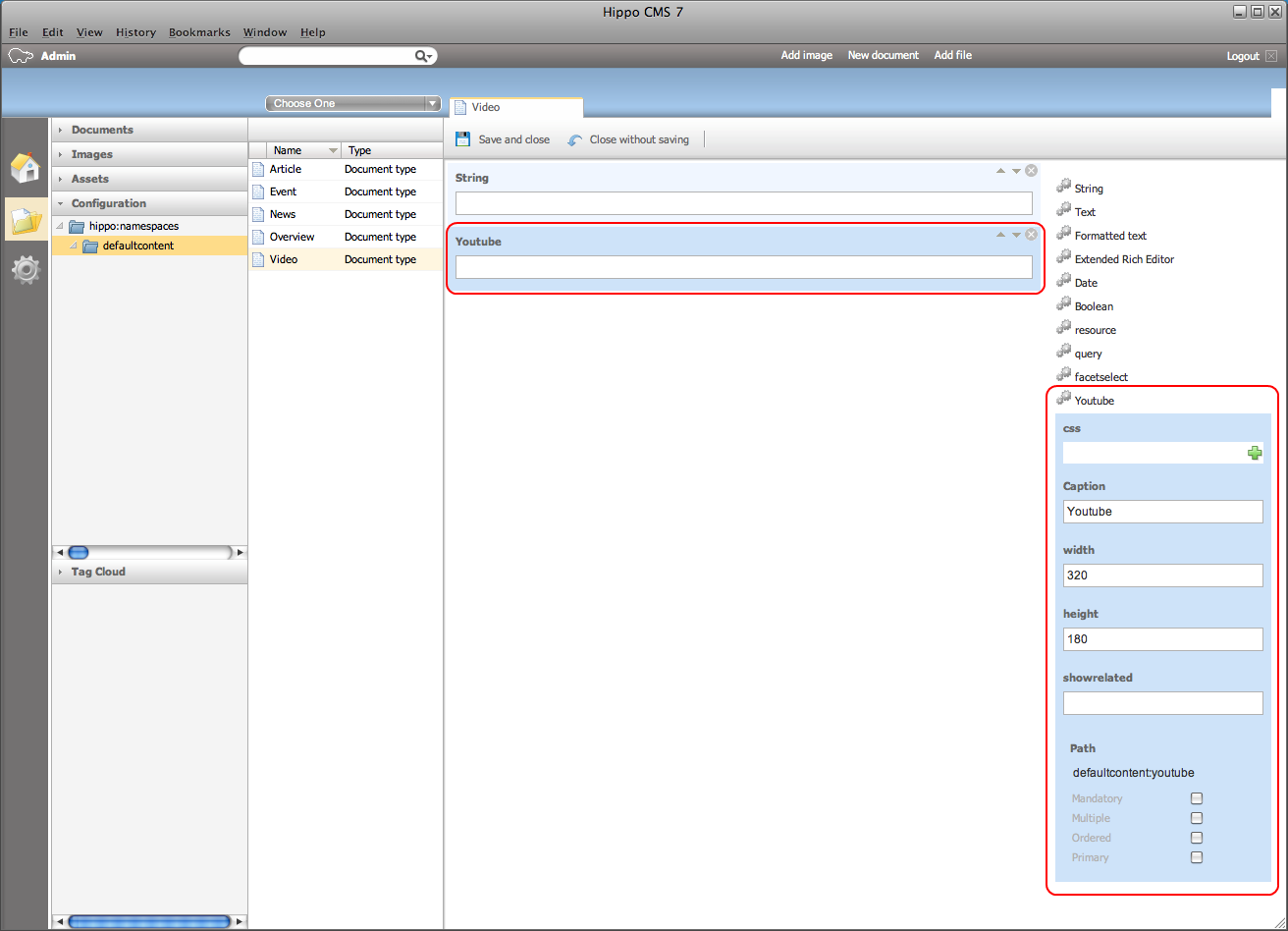 Now add the value Youtube to the templates property and save the changes. Make sure you log out of the CMS and back in (the list is cached in your session).