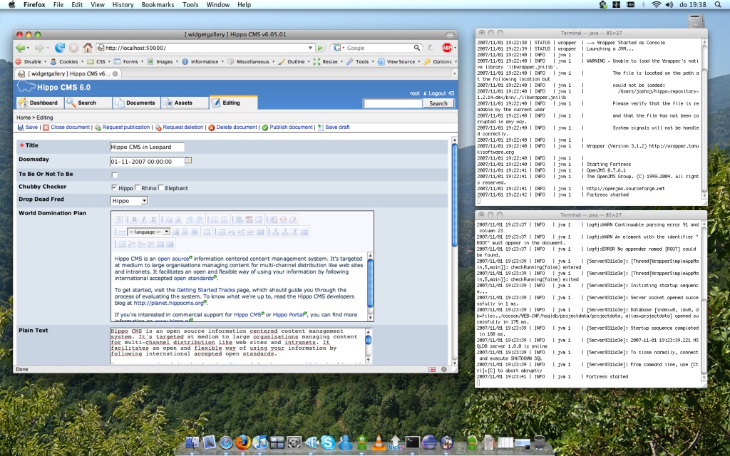 After buying my new iMac I was curious how easy it was to get Hippo CMS running in Leopard (MacOS X 10.5). Well, it was very easy. I downloaded the latest stable releases of Hippo CMS and Hippo Repository, typed from the terminal sh bin/fortress.sh console and I was able to use Hippo CMS in Firefox.