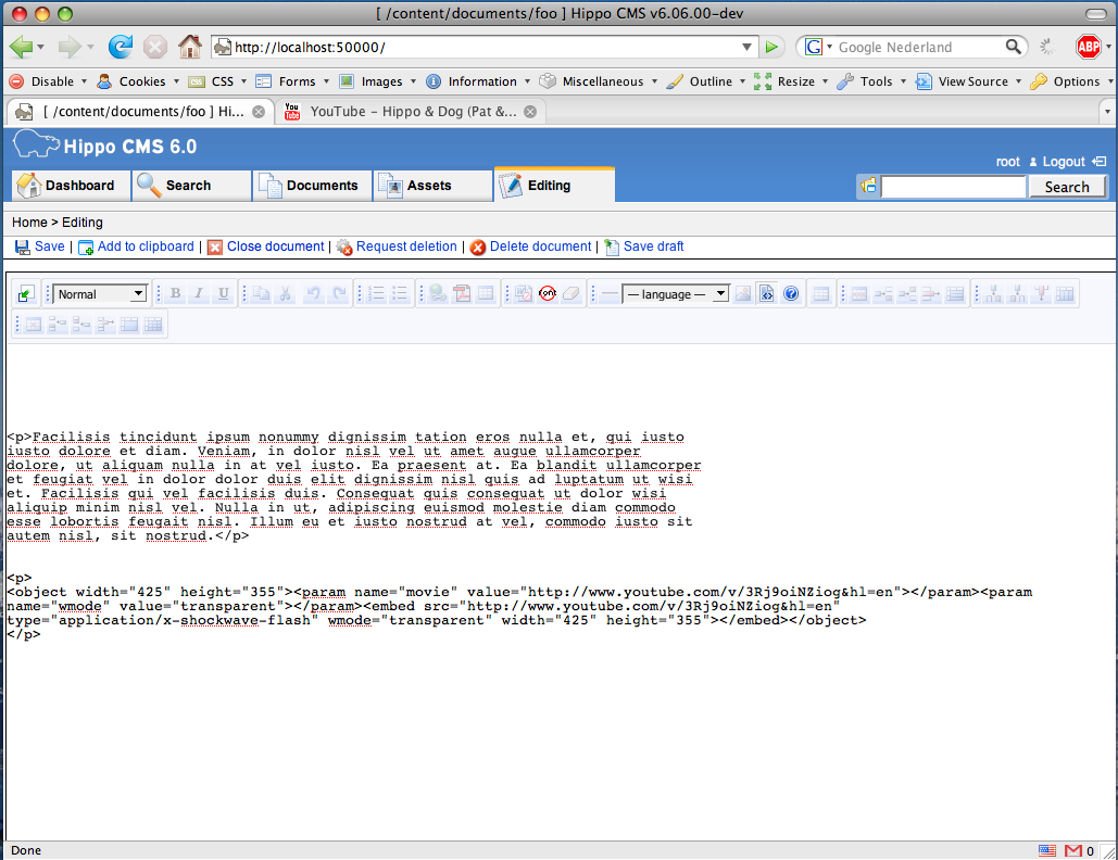 For anyone who has tried to add YouTube’s embed code into the Xinha What You See Is What You Get (WYSIWYG) editor of Hippo CMS: Yes it’s possible to add references to YouTube, Google video or any other Flash animation. No, just copy-pasting the HTML snippet from YouTube or Google video will not work, because it is not valid XHTML. I will explain how to enable YouTube support in Hippo CMS.