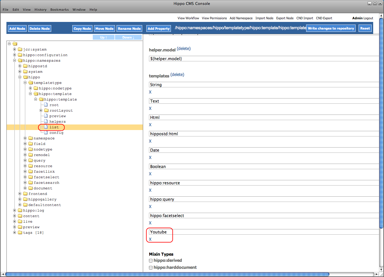 Now add the value Youtube to the templates property and save the changes. Make sure you log out of the CMS and back in (the list is cached in your session).