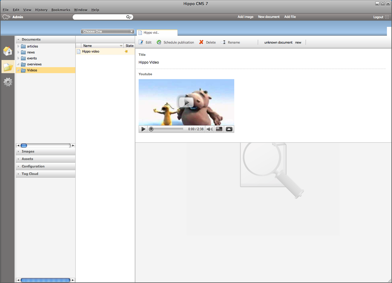 The YouTube Template Plug-in is a very small, but cool project in the Hippo ECM forge. The plugin was created by our former intern Jeroen Tietema. With this plug-in you can easily add YouTube videos to your documents. In this blog I’ll explain how to add this plug-in into your Hippo ECM project. I assume you have already checked out and built Hippo ECM from source.